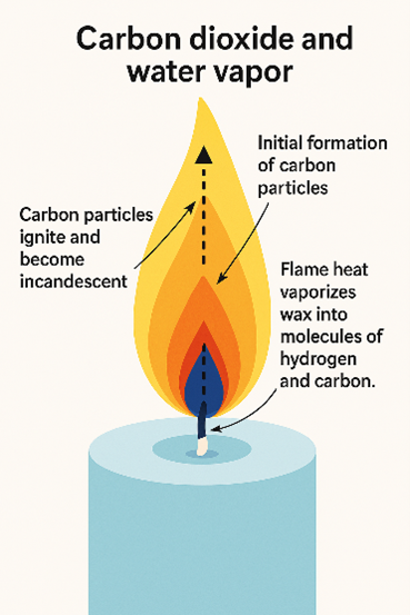 اگر از نزدیک به شعله شمع نگاه کنید، یک ناحیه آبی در پایه شعله خواهید دید. بالای آن یک بخش کوچک نارنجی-قهوهای تیره وجود دارد و بالای آن ناحیه زرد بزرگ است که ما آن را با شعلههای شمع مرتبط میدانیم.